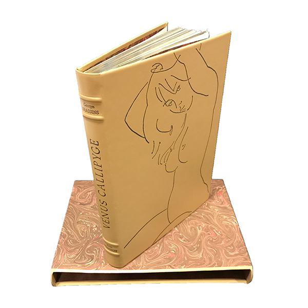 Reliure cuir sable sous étui ou en feuilles dans un étui tissu